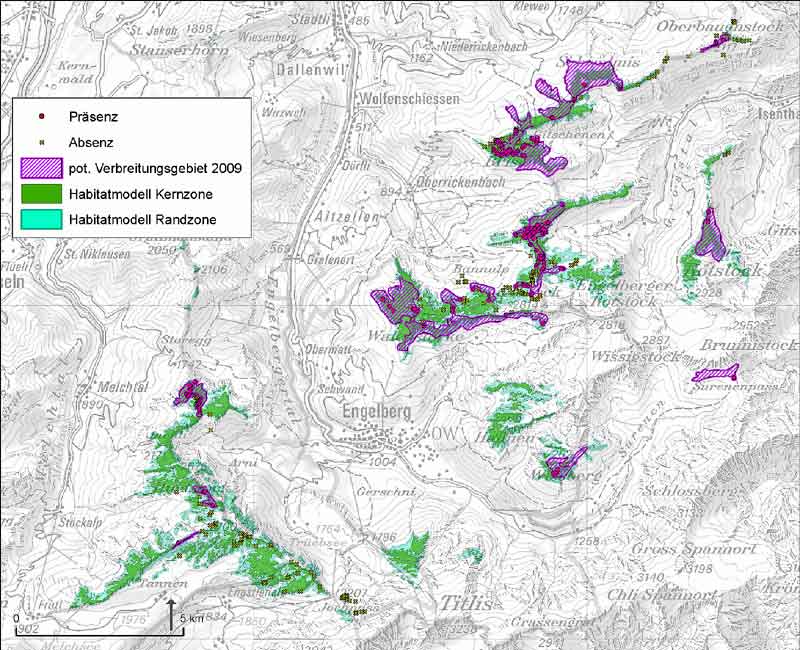 Aktuelles Verbreitungsgebiet von Trochulus biconicus aufgrund der gutachtlichen Einschätzung aller Funde und den Resultaten der Habitatmodellierung. Nicht als rote Punkte aufgeführt sind die Funde am Huetstock und am Uri Rotstock Westhang, sowie zwei Funde östlich des Uri Rotstock.