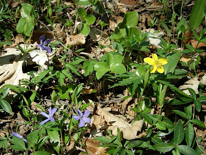 Gelbes Buschwindröschen, Immergrün und Leberblümchen im Unterwuchs eines mit dem Lungenkraut-Buchenwald im Übergang zum Ahorn-Eschenwald vergleichbaren Waldstandortes bei Mendrisio (TI)