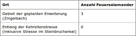 Wie das Beispiel der Zählung vom 26.4.1997 belegt, hält sich der Feuersalamander im Gebiet der geplanten Erweiterung auf. Es wurde vermutet, dass er im Zingelbach seine Larven absetzt.