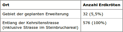 Wie das Beispiel der Erhebung vom 26.4.1997 belegt, sind rund 5% der wandernden Erdkröten von der Steinbrucherweiterung betroffen. Die Auswirkung des Projekts auf die Erdkrötenwanderung wurde damit zwar nachgewiesen, jedoch als gering eingestuft.